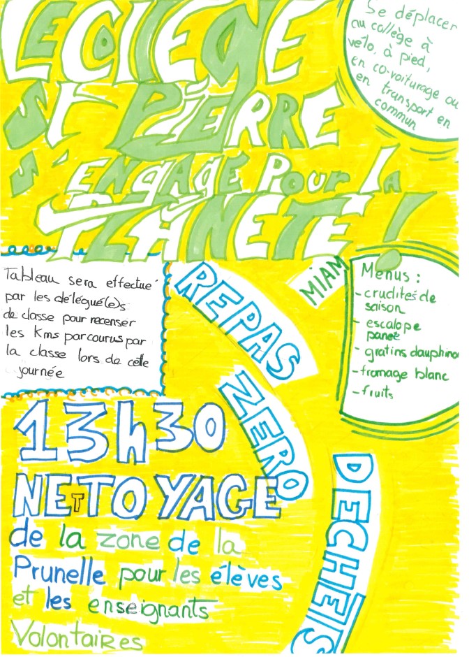 Préférence des déplacements écologiques, repas zéro déchet et ramassage des déchets sur la zone de la Prunelle Merci à l’ensemble des élèves délégués qui participent à l’organisation de cette journée et à Rouslan (5A) qui a réalisé l’affiche