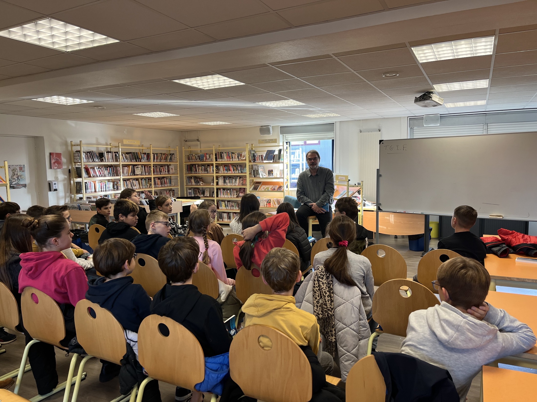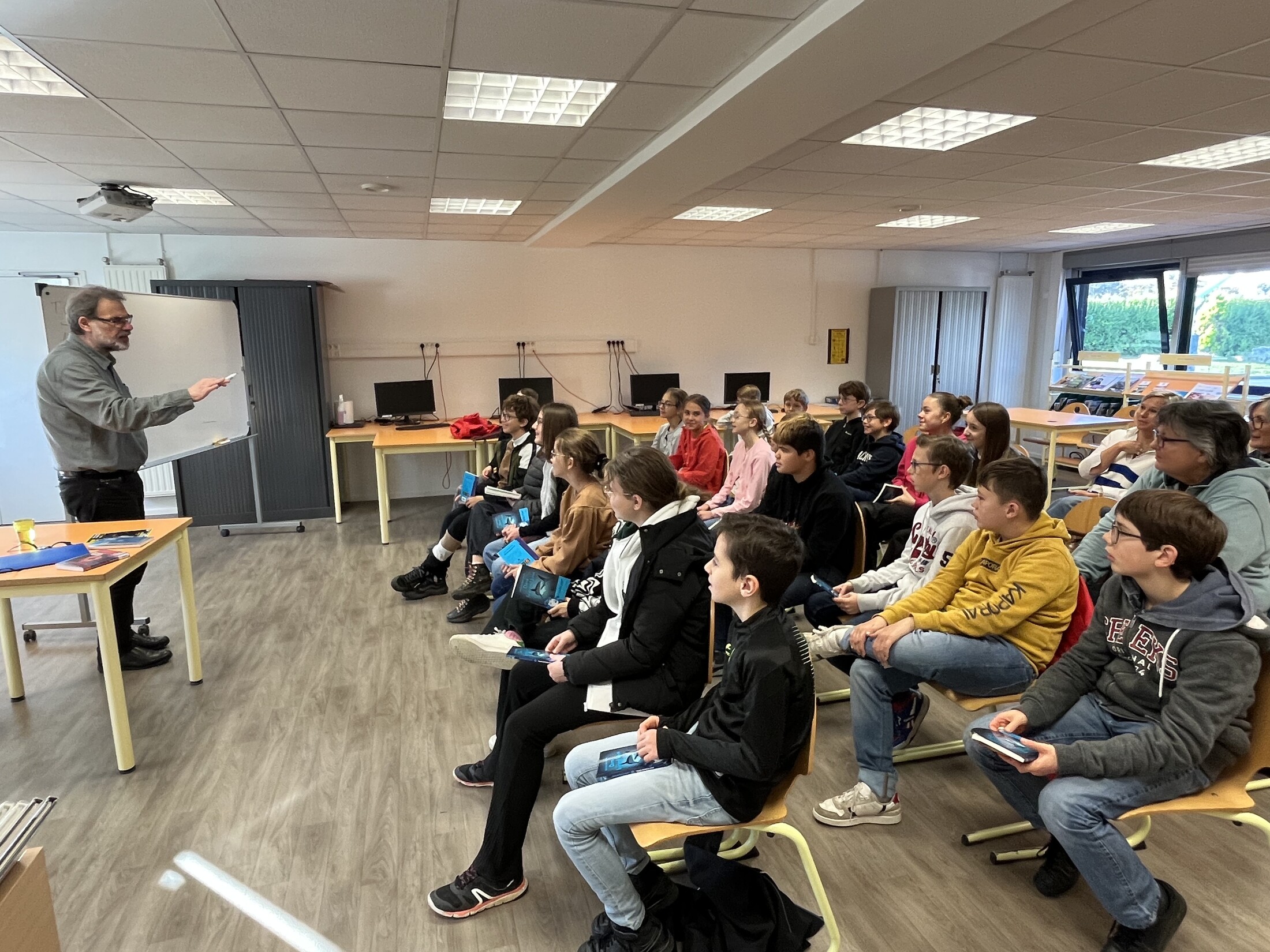 Vendredi 17 novembre, deux classes de 6ème ont eu le plaisir de rencontrer Jean-Hugues OPPEL, auteur de littérature jeunesse. Cet échange était organisé dans le cadre du salon du polar et du roman noir « Noir sur la ville » à Lamballe. Le roman « Dans le grand bain » choisi pour cette rencontre a suscité de nombreuses questions que les élèves avaient préparées en cours. Mmes Barbot, Josset-Marie et Lavigne, à l’initiative du projet, ont été ravies de la qualité des échanges entre les élèves et l’auteur. Ce temps fort littéraire va certainement donner l’envie aux élèves de da-vantage lire mais aussi, pourquoi pas, de passer à l’écriture de leurs propres histoires...